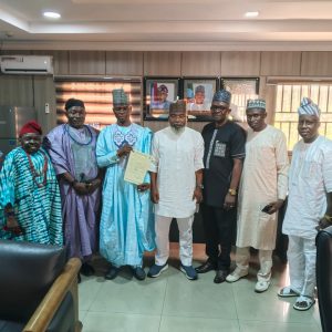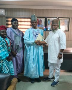 The Commissioner for Local Government and Chieftaincy Affairs, Barr Salami Momodu Ozigi Deedat presents appointment letter to HRH, Alh. Ibrahim Amodu Ejah, the Atamodu of Odu and