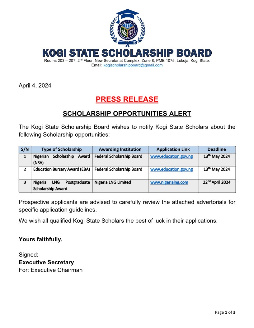 The Kogi State Scholarship Board wishes to notify Kogi State Scholars about the following scholarship opportunities:.